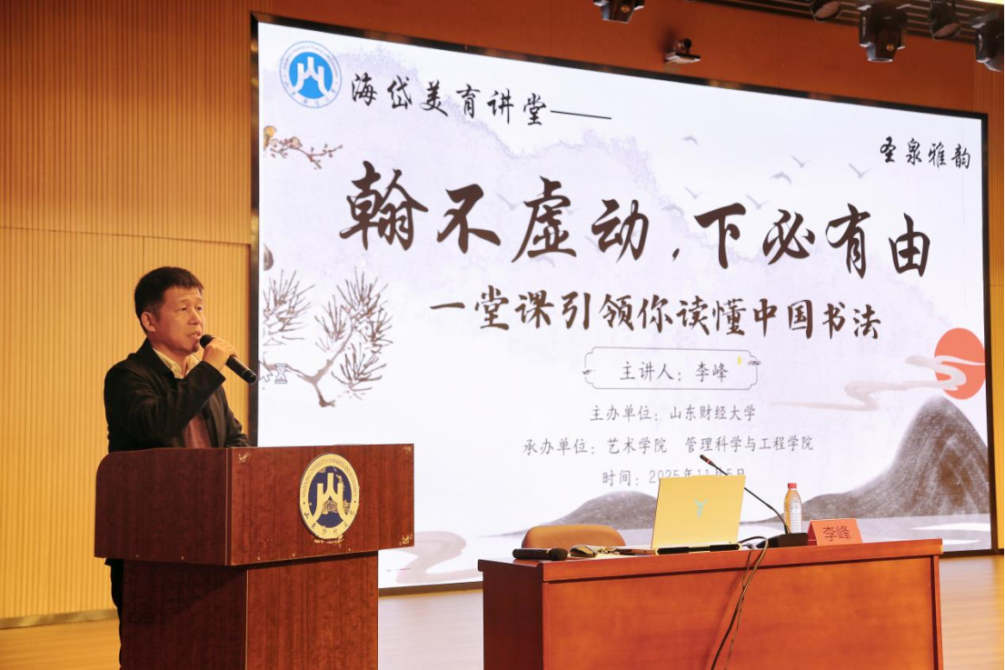 11月5日,为提升我院学生人文修养,按照学院“圣泉雅韵”系列活动方案,我院邀请tyc122cc太阳成集团艺术学院副教授、硕士研究生导师李峰以《“翰不虚动,下必有由:一堂课引领你读懂中国书法”》为题,在章丘校区文化活动中心报告厅讲解书法之美,引领美育走进学生生活。讲座由太阳成集团122ccvip党委副书记刘思锋主持,学院2025级学生近400人参加讲座。