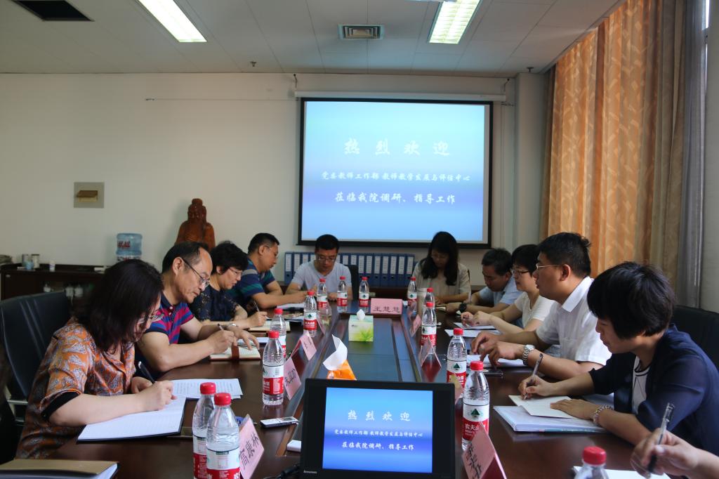 为贯彻落实《中共tyc122cc太阳成集团委员会关于开展“大学习、大调研、大改进”工作实施方案》通知要求,全面了解和掌握我校教师思想动态,5月28日上午,学校党委教师工作部、教师教学发展与评估中心主任刘旻航,副主任苏丽娜、孟蕾等一行六人对我院教师发展情况进行调研。