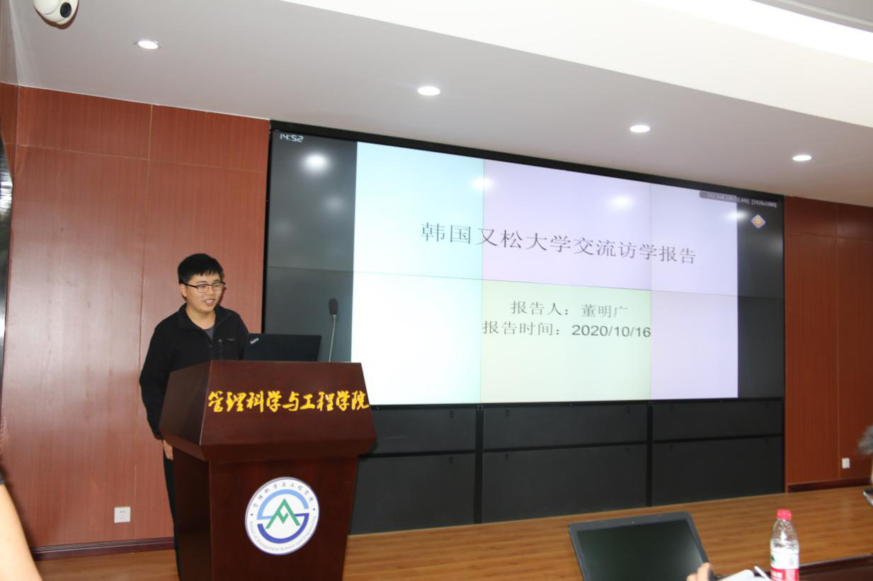 丁晓燕同学于2019年8月2日-2020年8月3日赴新加坡国立大学进行为期一年的访学。交流会上,丁晓燕同学从前期准备、访学学习与生活、个人思考与体会等四个方面展开汇报交流。丁晓燕结合自身在新加坡的交流学习经历,重点讲解了新加坡信息系统博士生研究领域现状、研究生怎样做好科学研究以及如何写好博士论文,展现了新加坡国立大学浓厚的学习氛围。18级董明广、刘喜全两位同学则是通过分享自己在韩国又松大学访学的课程学习、文化体验经历提醒同学们正确认识访学项目的目的,访学期间做好时间管理,养成良好学习习惯,保证身体健康。